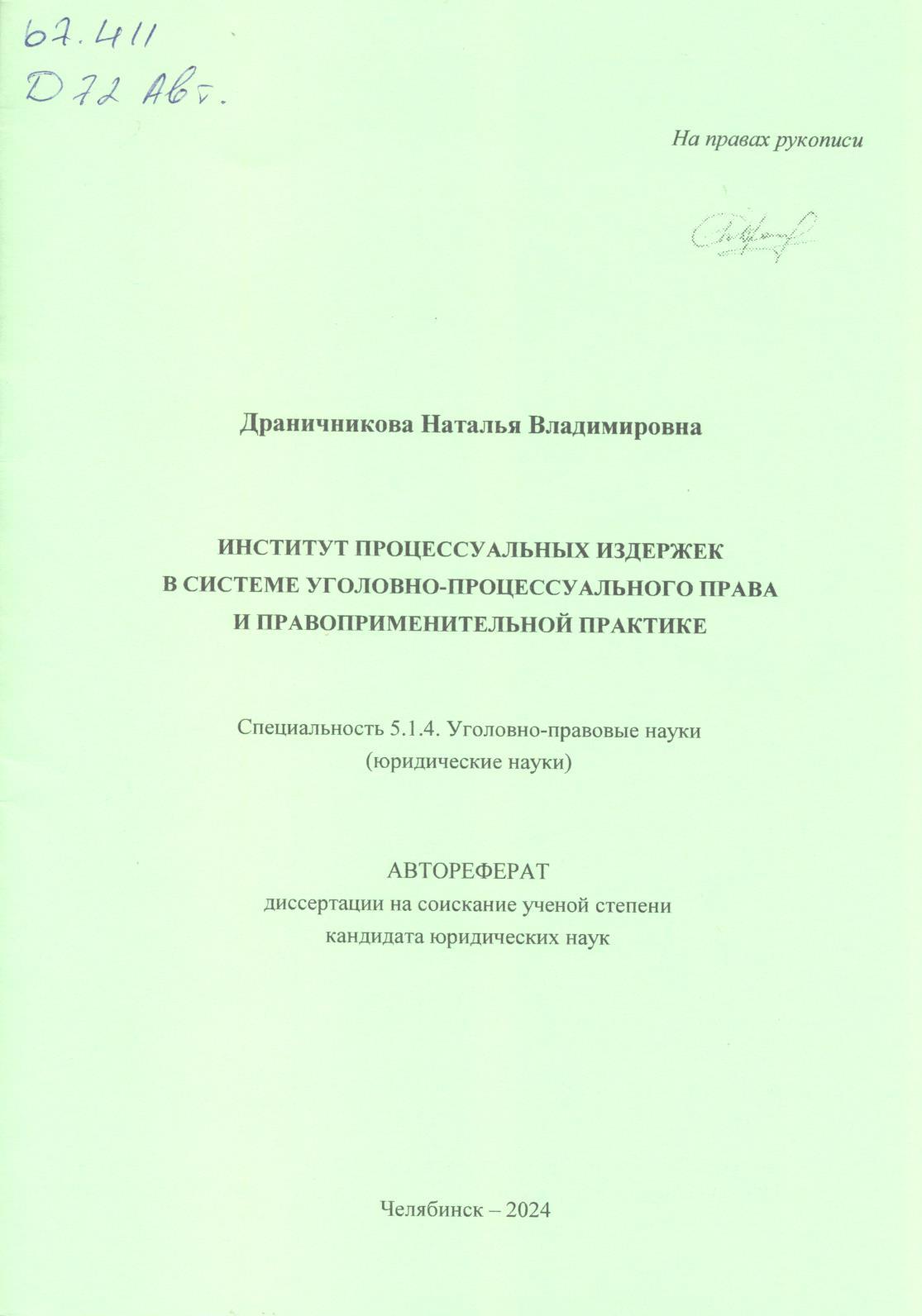 Институт процессуальных издержек в системе уголовно-процессуального права и правоприменительной п...: автореферат диссертации на соискание ученой степени кандидата юридических наук