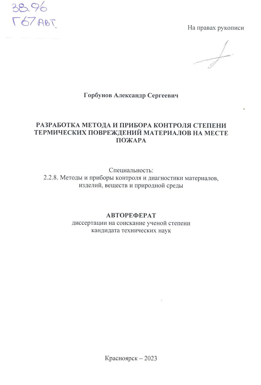 Разработка метода и прибора контроля степени термических повреждений материалов на месте пожара :...: автореферат диссертации на соискание ученой степени кандидат технических наук