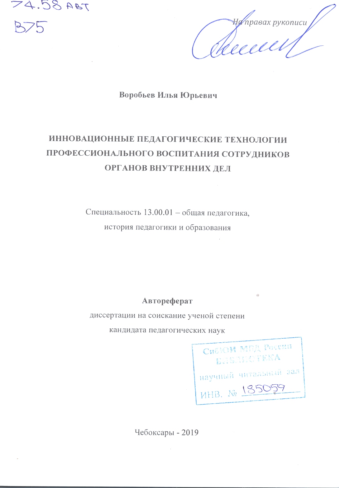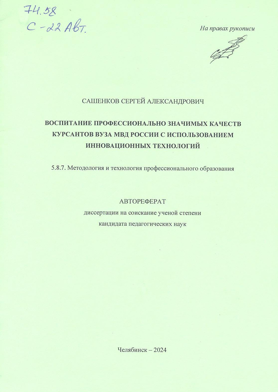 Воспитание профессионально значимых качеств курсантов вуза МВД России с использованием инновацион...: автореферат на соискание ученой степени кандидата педагогических наук : 5.8.7