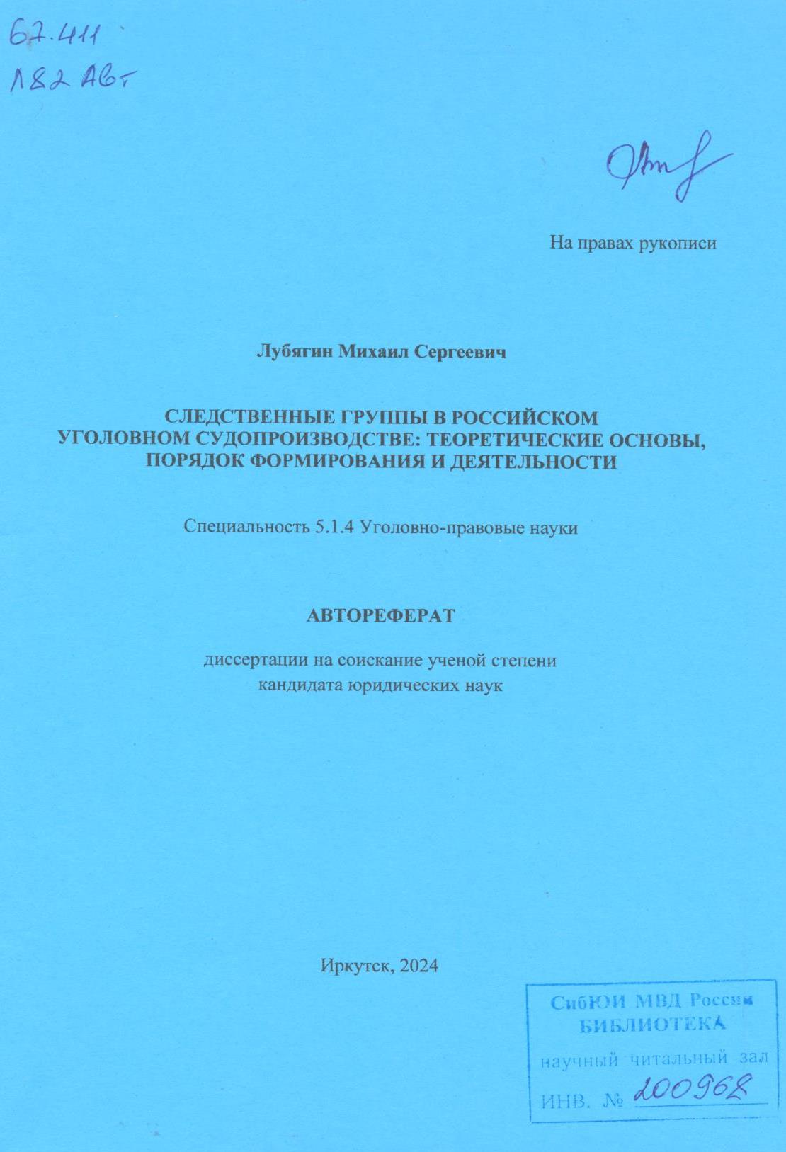 Следственные группы в Российском уголовном судопроизводстве: теоретические основы, порядок формир...: автореферат диссертации на соискание ученой степени кандидата юридических наук