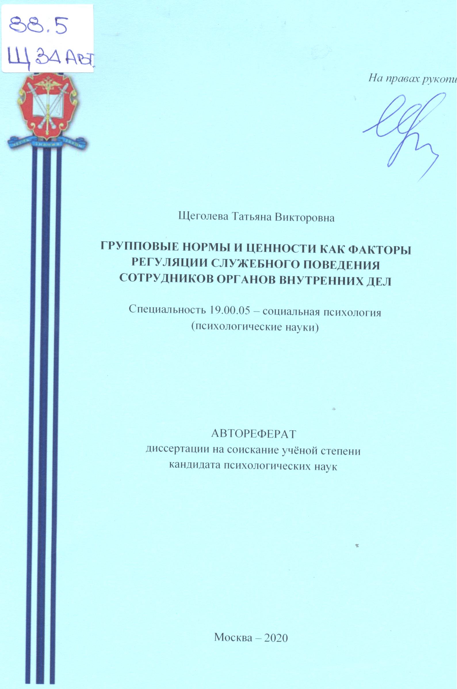 Групповые нормы и ценности как факторы регуляции служебного поведения сотрудников органов внутрен...: автореферат : 19.00.05
