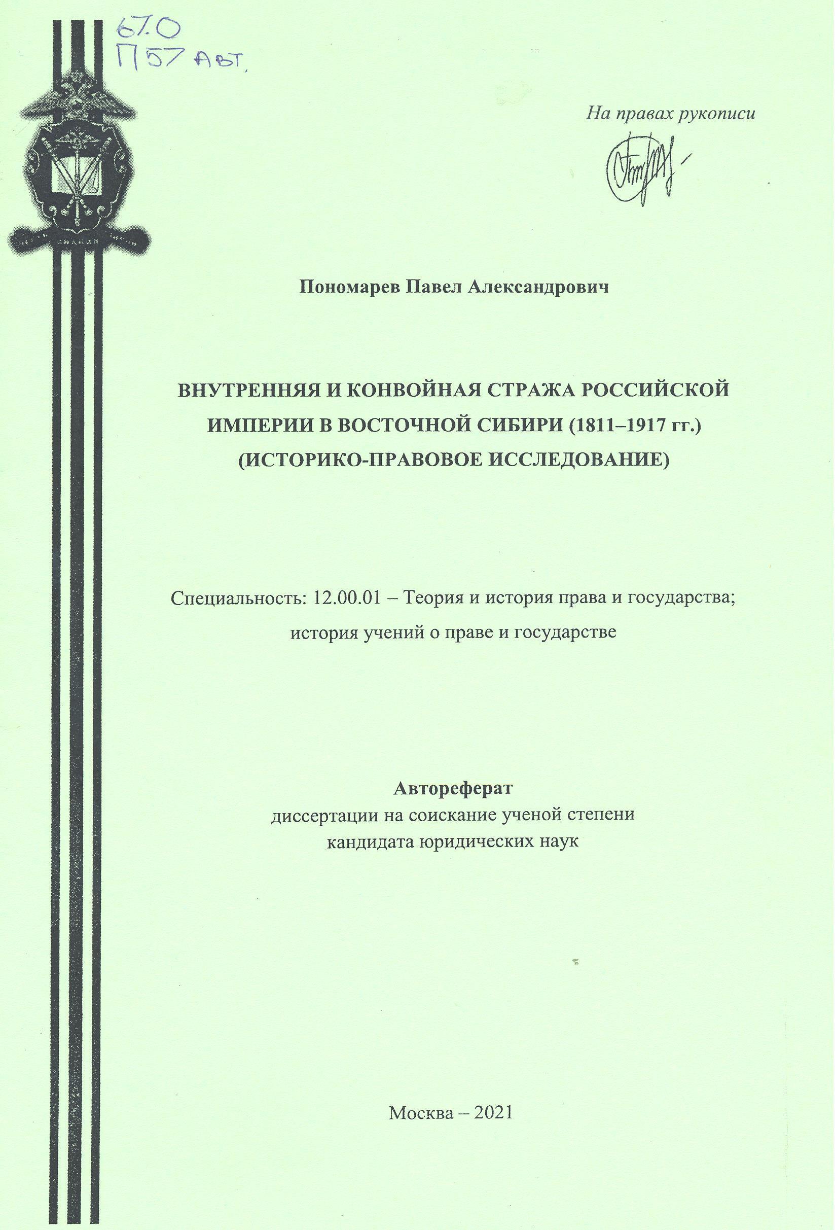 Внутренняя и конвойная стража Российской империи в Восточной Сибири (1811-1917 гг.) (историко-пра...: автореферат : 12.00.01
