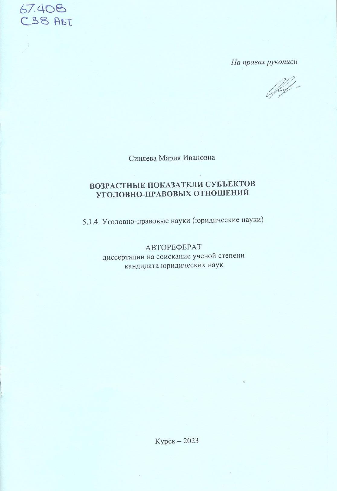 Возрастные показатели субъектов уголовно-правовых отношений : специальность 5.1.4 "Уголовно-право...: автореферат диссертации на соискание ученой степени кандидата юридических наук