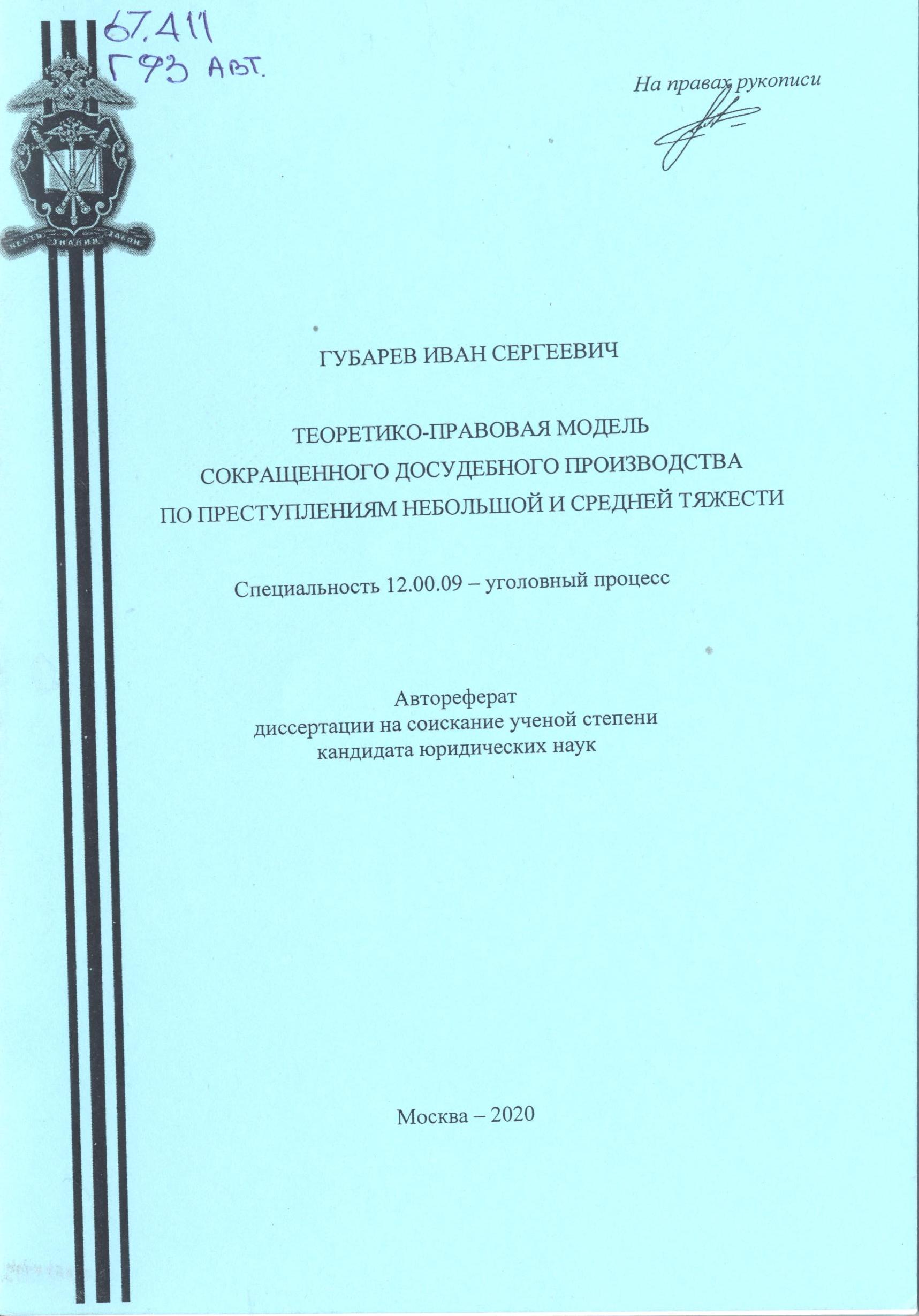Теоретико-правовая модель сокращенного досудебного производства по преступлениям небольшой и сред...: автореферат : 12.00.09