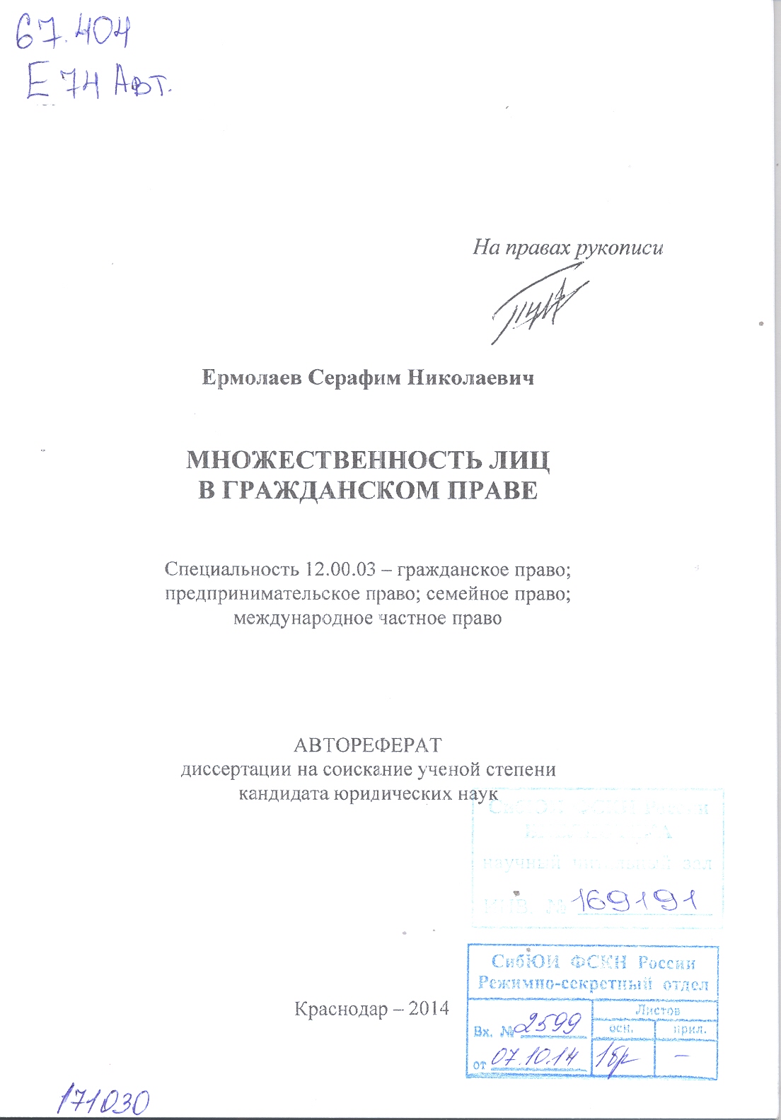 Множественность лиц в гражданском праве: автореферат: 12.00.03