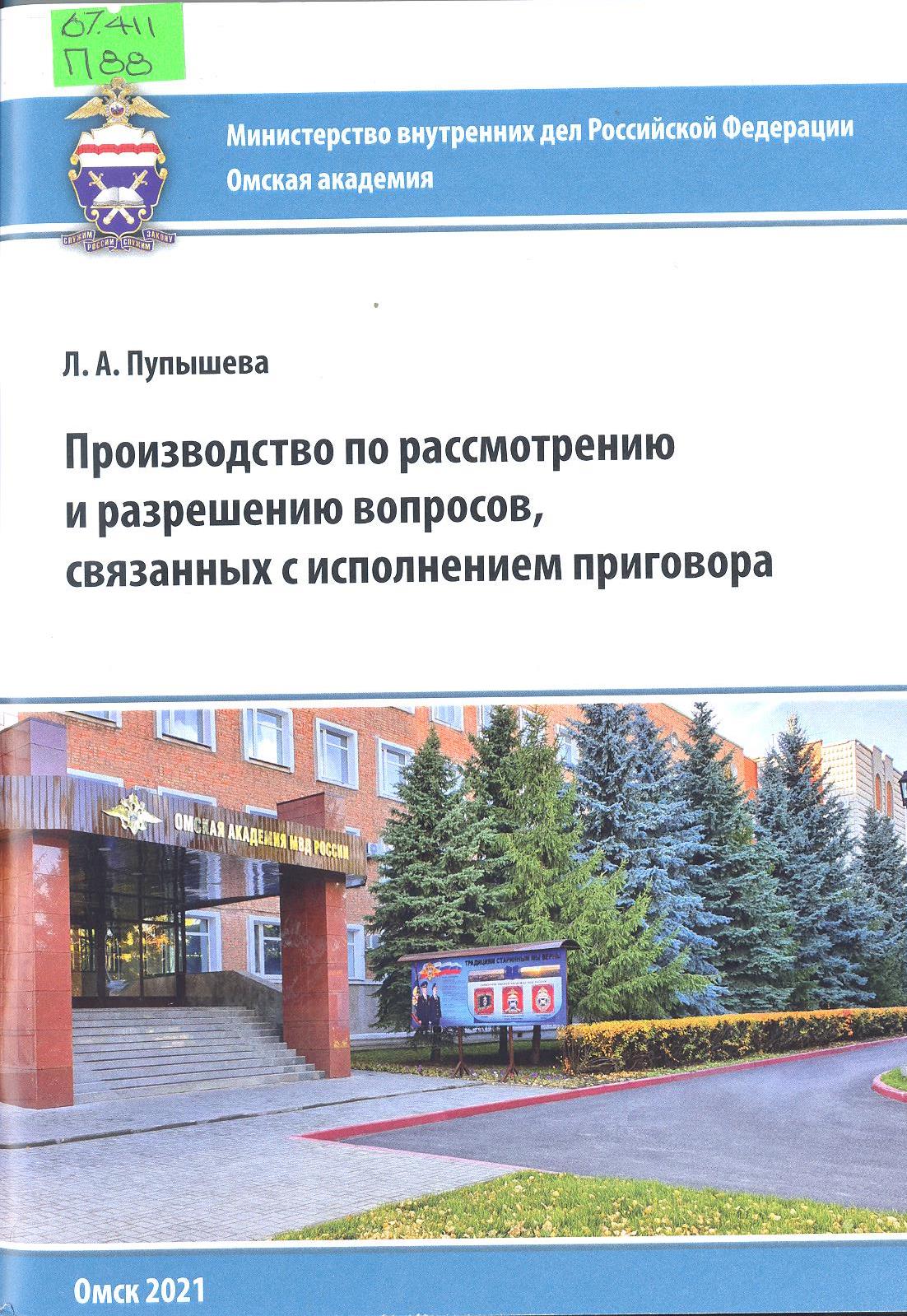 Производство по рассмотрению и разрешению вопросов связанных с исполнением приговора: учебное пособие