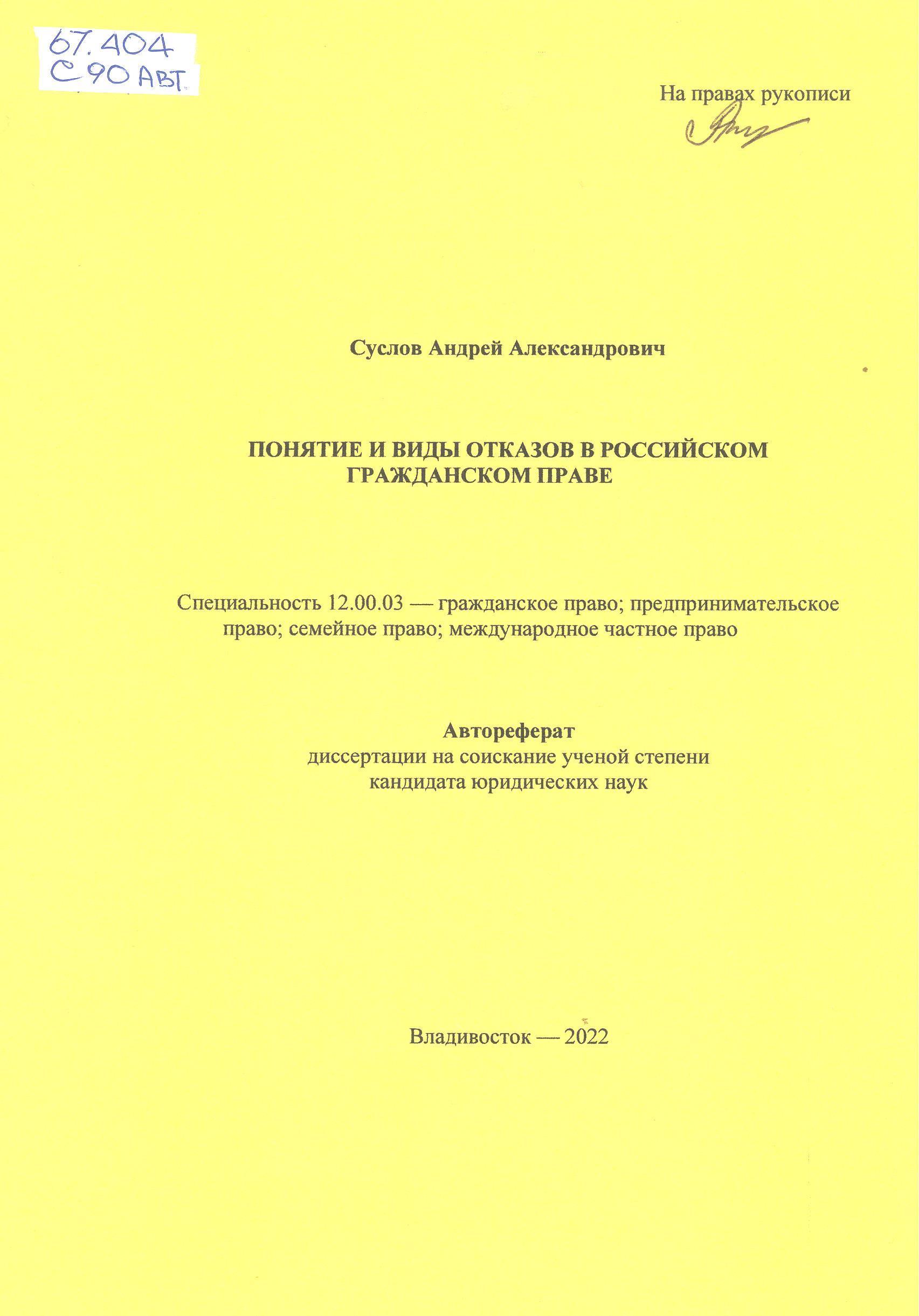 Понятие и виды отказов в российском гражданском праве: автореферат : 12.00.03