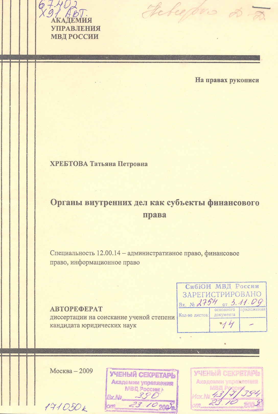 Органы внутренних дел как субъекты финансового права: автореферат: 12.00.14