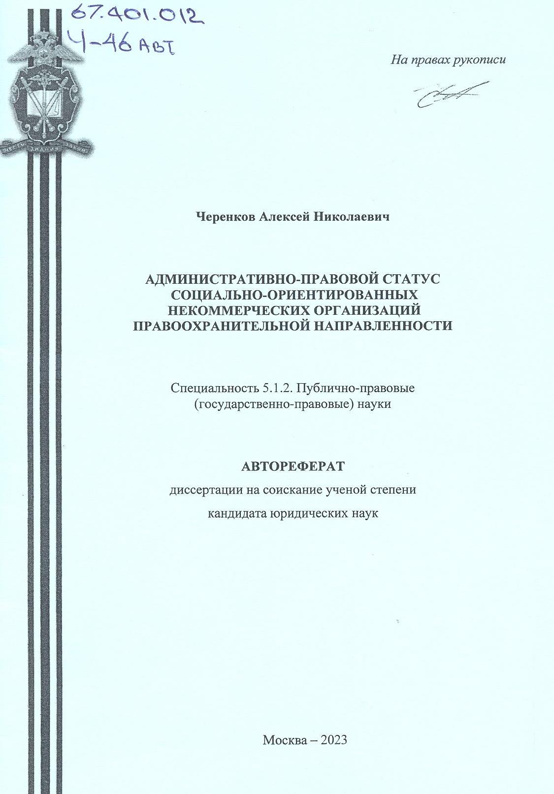 Административно-правовой статус социально-ориентированных некоммерческих организаций правоохранит...: автореферат диссертации на соискание ученой степени кандидата юридических наук