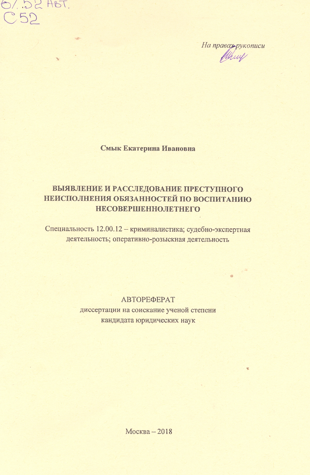 Выявление и расследование преступного неисполнения обязанностей по воспитанию несовершеннолетнего: автореферат : 12.00.12