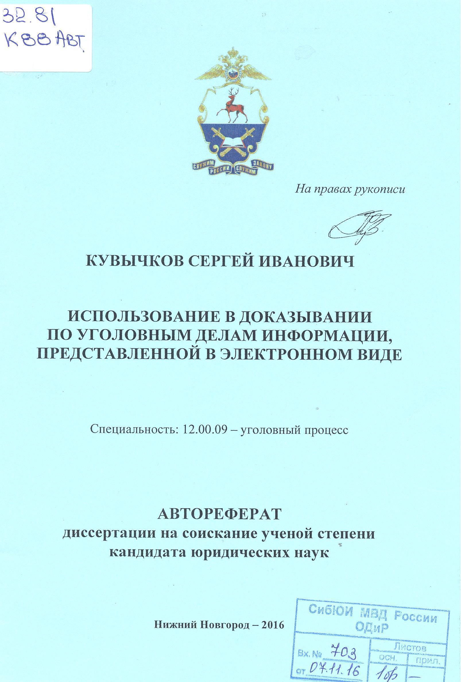 Использование в доказывании по уголовным делам информации, представленной в электронном виде: автореферат : 12.00.09