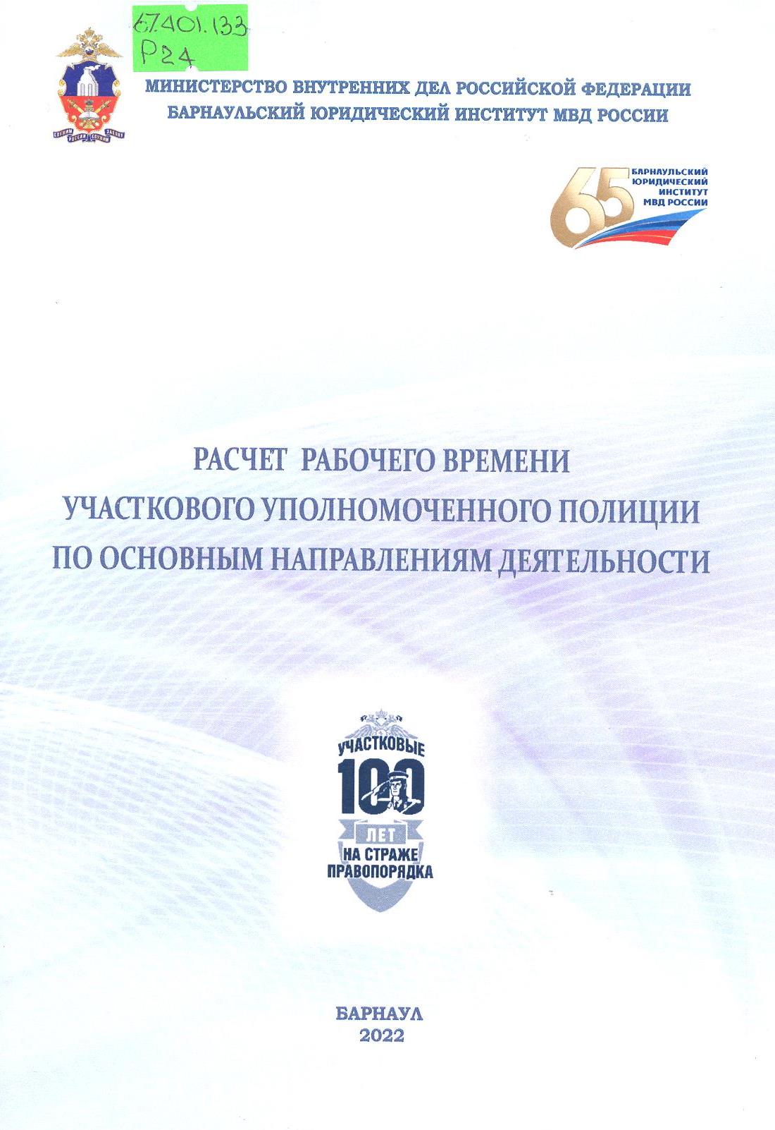 Расчет рабочего времени участкового уполномоченного полиции по основным направлениям деятельности: методические рекомендации