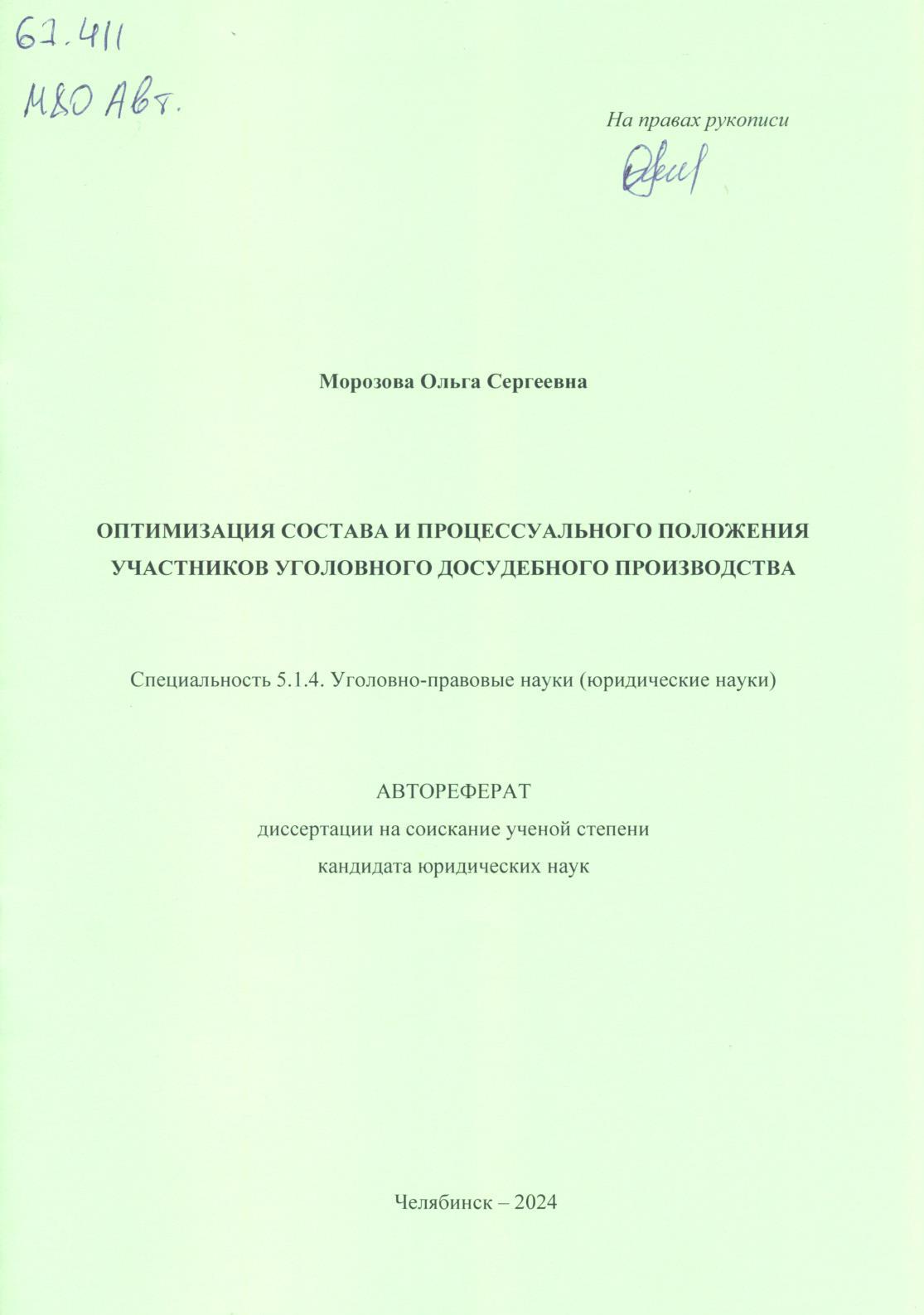 Оптимизация состава и процессуального положения участников уголовного досудебного производства: автореферат диссертации на соискание ученой степени кандидата юридических наук