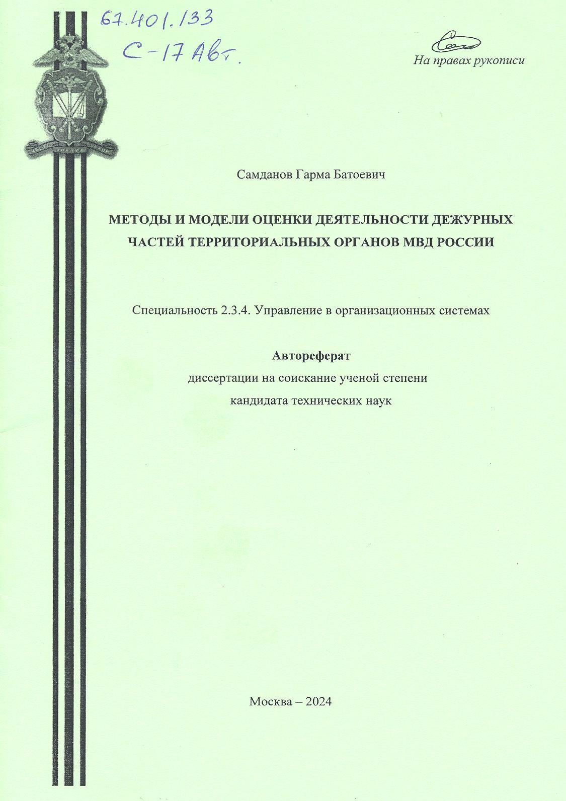 Методы и модели оценки деятельности дежурных частей территориальных органов МВД России: автореферат на соискание ученой степени кандидата технических наук : 2.3.4. Управление в организационных сист...