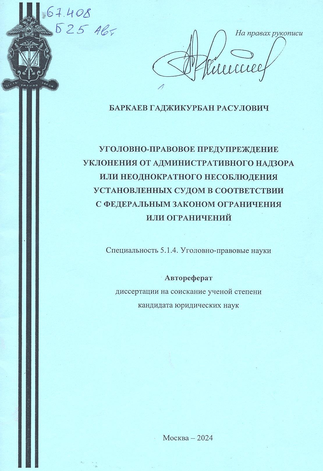 Уголовно-правовое предупреждение уклонения от административного надзора или неоднократного несобл...: автореферат диссертации на соискание ученой степени кандидата юридических наук