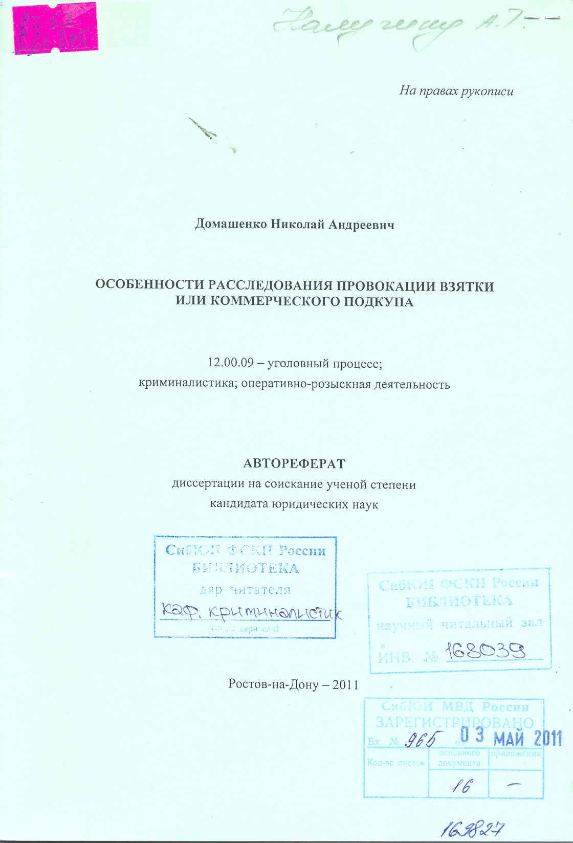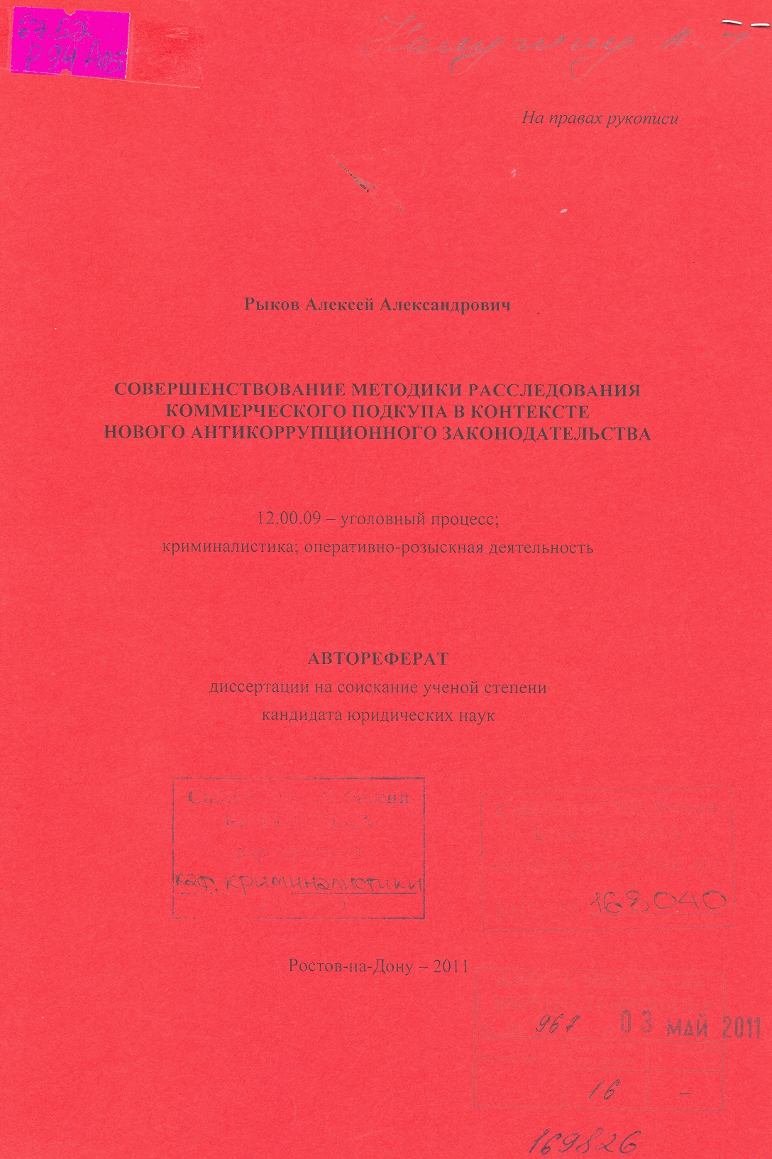 Особенности расследования провокации взятки или коммерческого подкупа: автореферат: 12.00.09