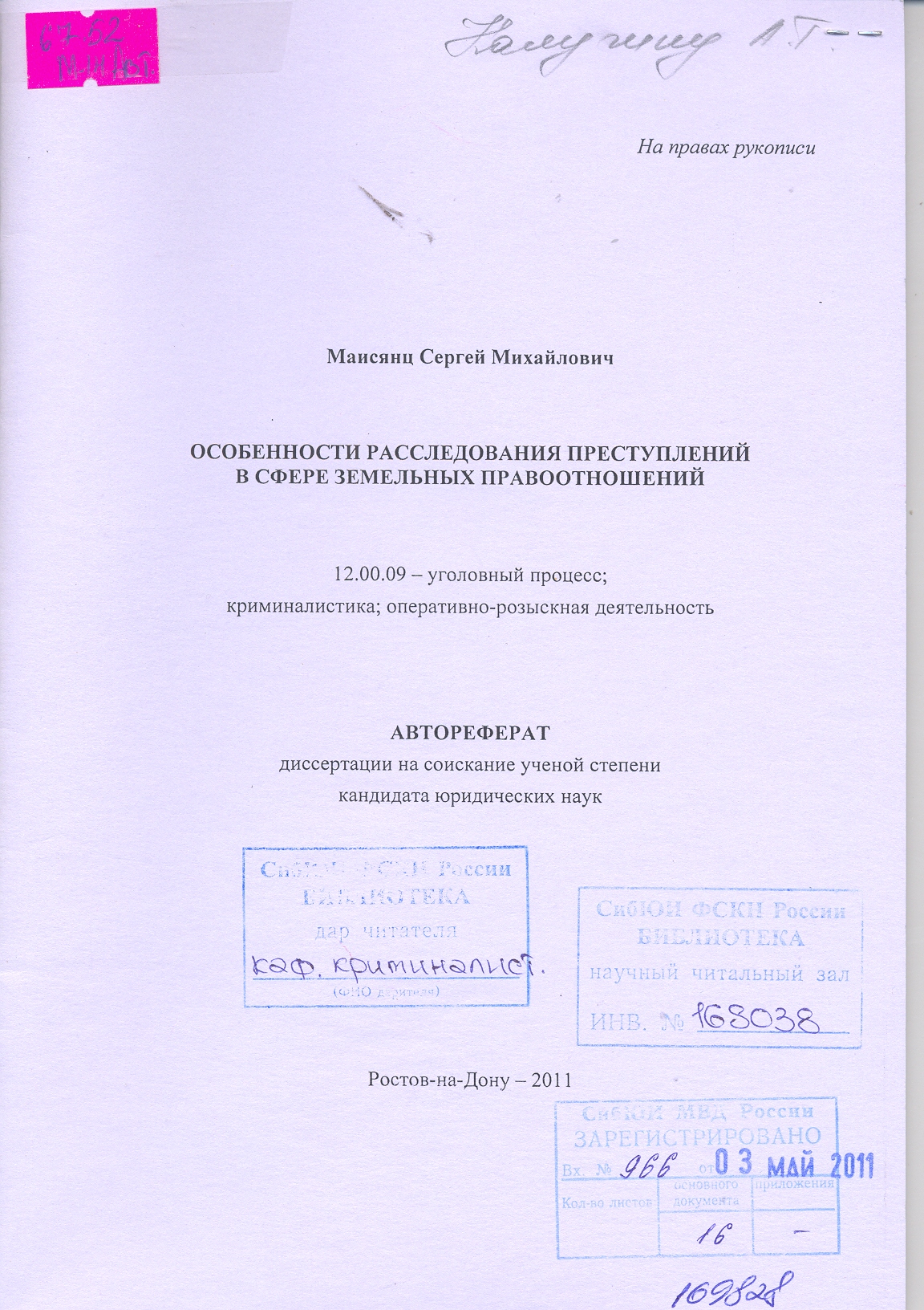 Особенности расследования преступлений в сфере земельных правоотношений: автореферат: 12.00.09