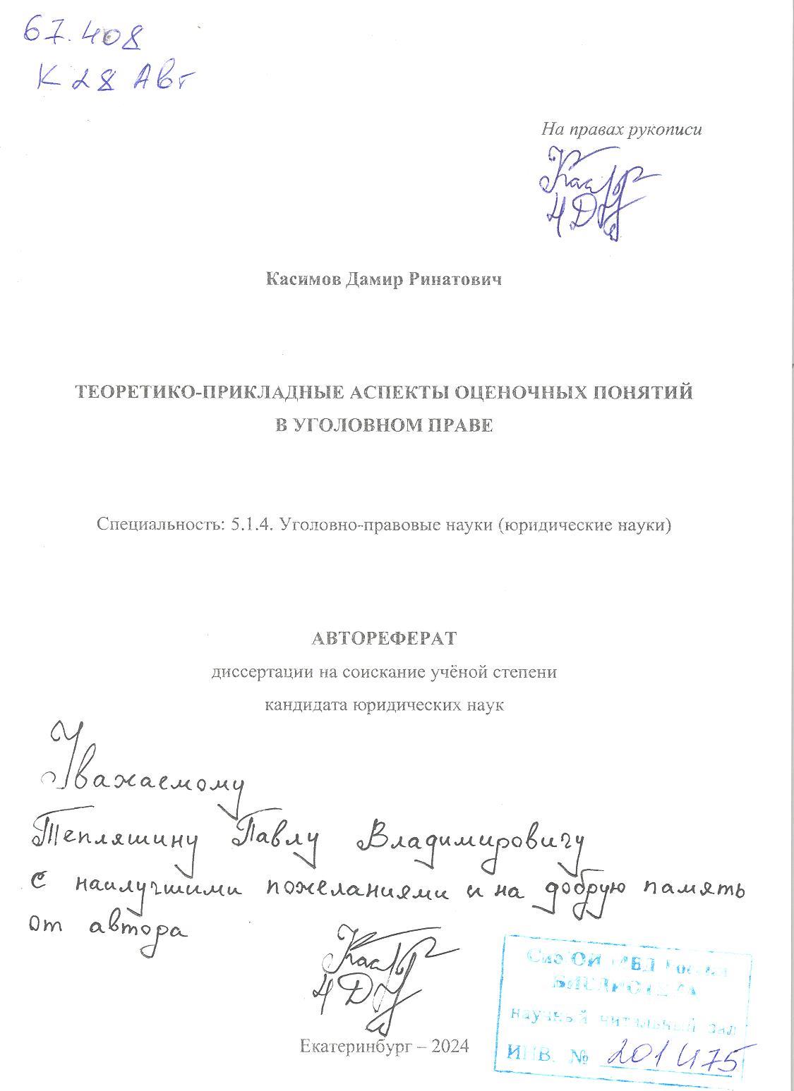 Теоретико-прикладные аспекты оценочных понятий у уголовном праве: специальность: 5.1.4. Уголовно-...: автореферат диссертации на соискание ученой степени кандидата юридических наук
