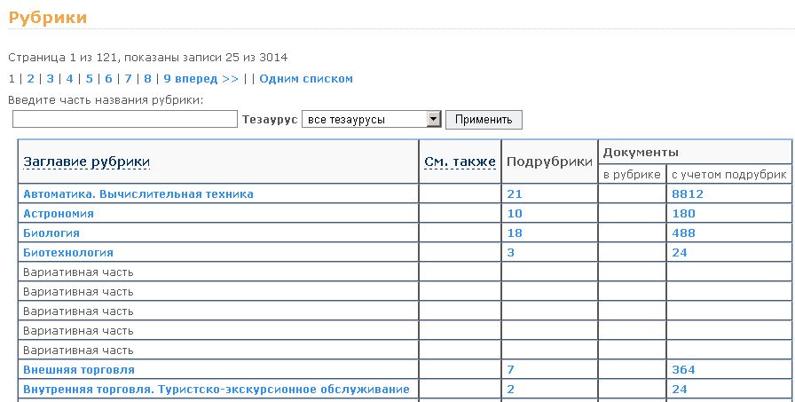 авторам, издательствам, сериям, тезаурусу (рубрикам).
