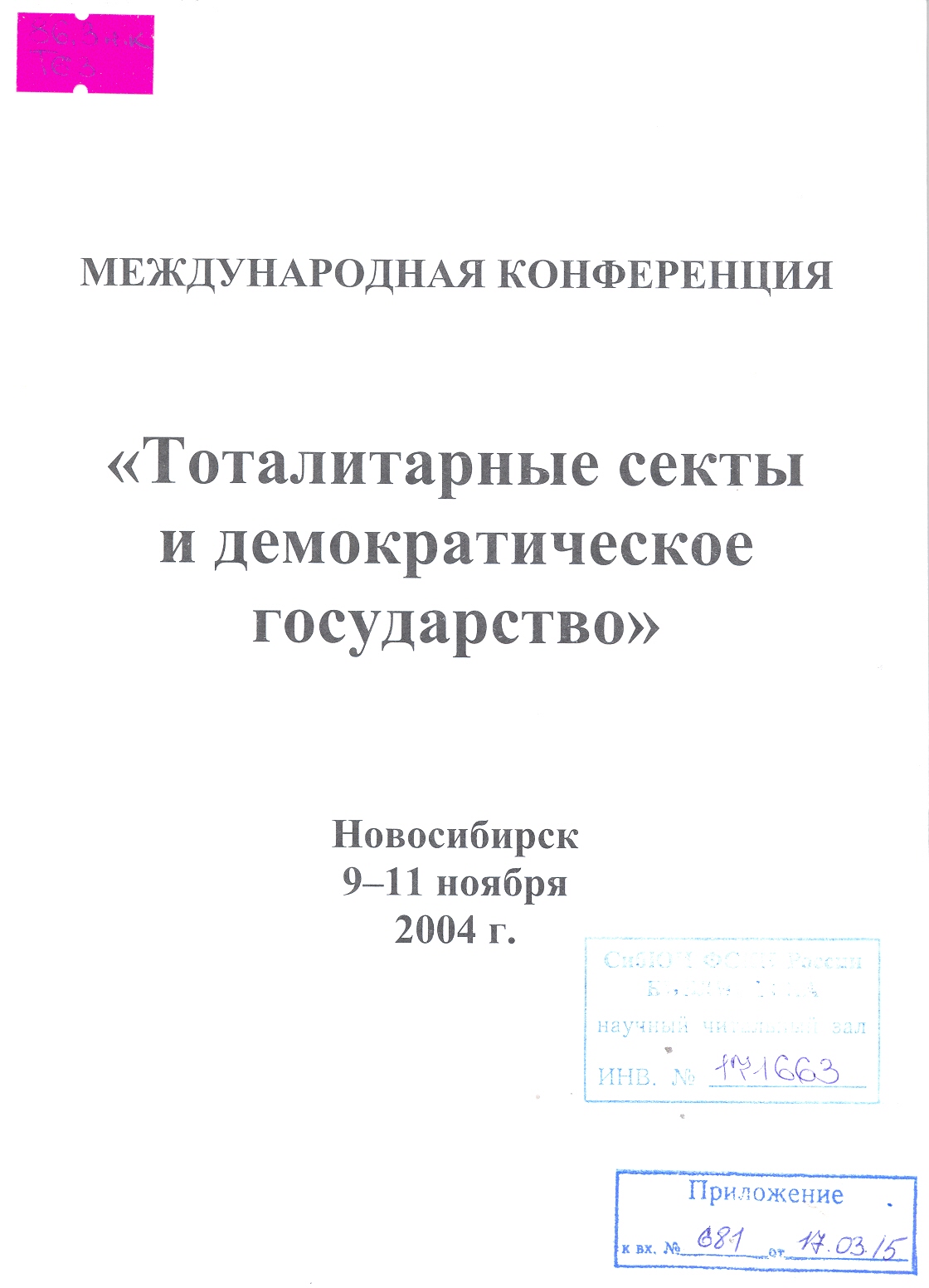 Тоталитарные секты и демократическое государство: международная научно-практическая конференция (г.Новосибирск, 9-11 ноября 2004 г.)