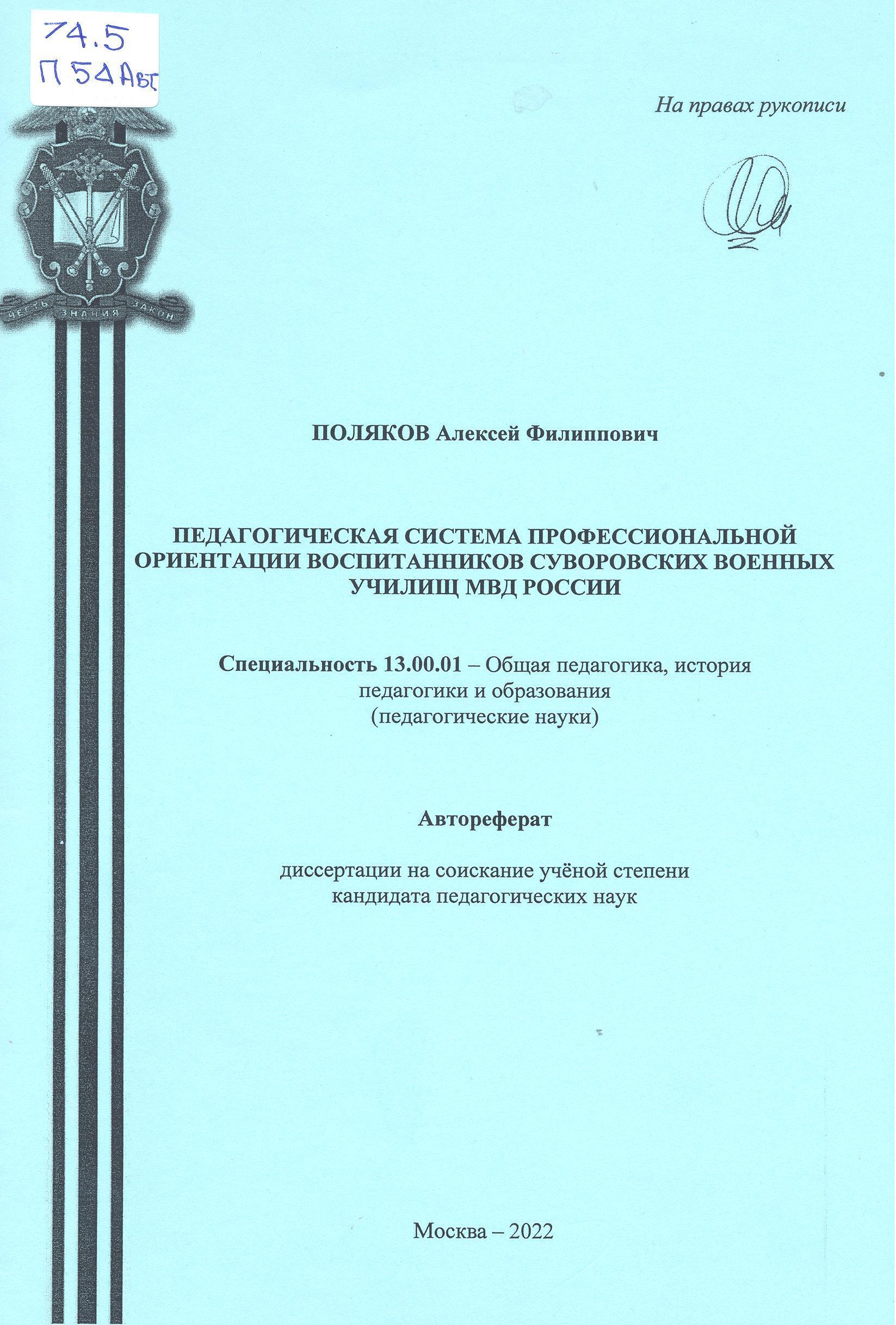 Педагогическая система профессиональной ориентации воспитанников суворовских военных училищ МВД Р...: автореферат : 13.00.01