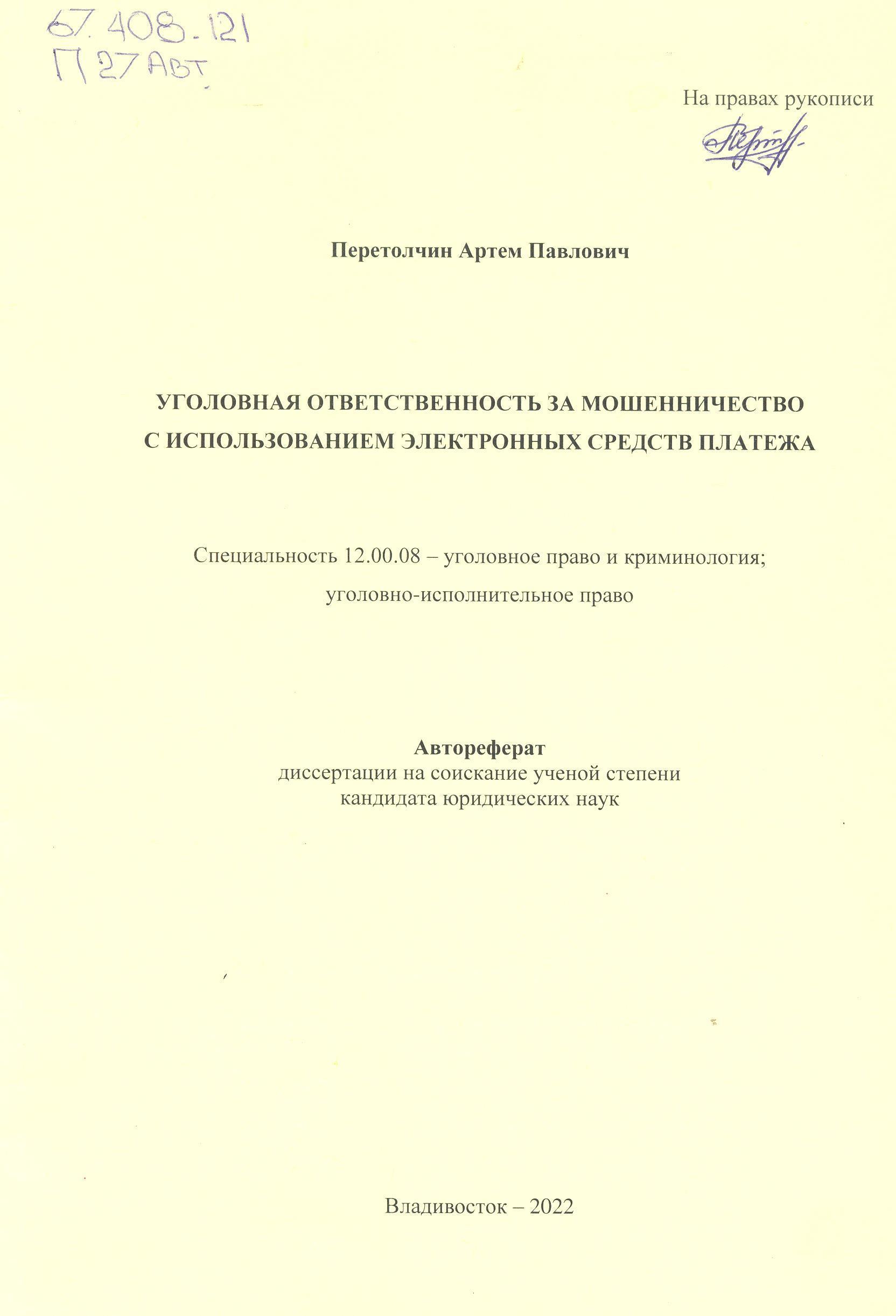 Уголовная ответственность за мошенничество с использованием электронных средств платежа: автореферат : 12.00.08