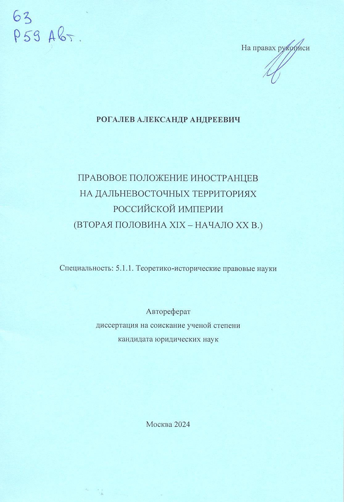 Правовое положение иностранцев на дальневосточных территориях Российской империи (вторая половина...: автореферат диссертации на соискание ученой степени кандидата юридических наук : научная специа...