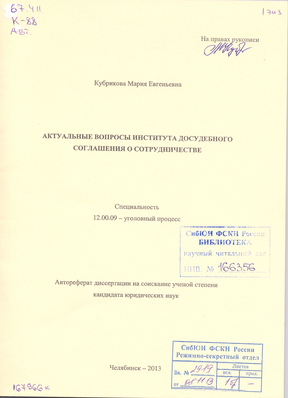 Актуальные вопросы института досудебного соглашения о сотрудничестве: автореферат: 12.00.09.