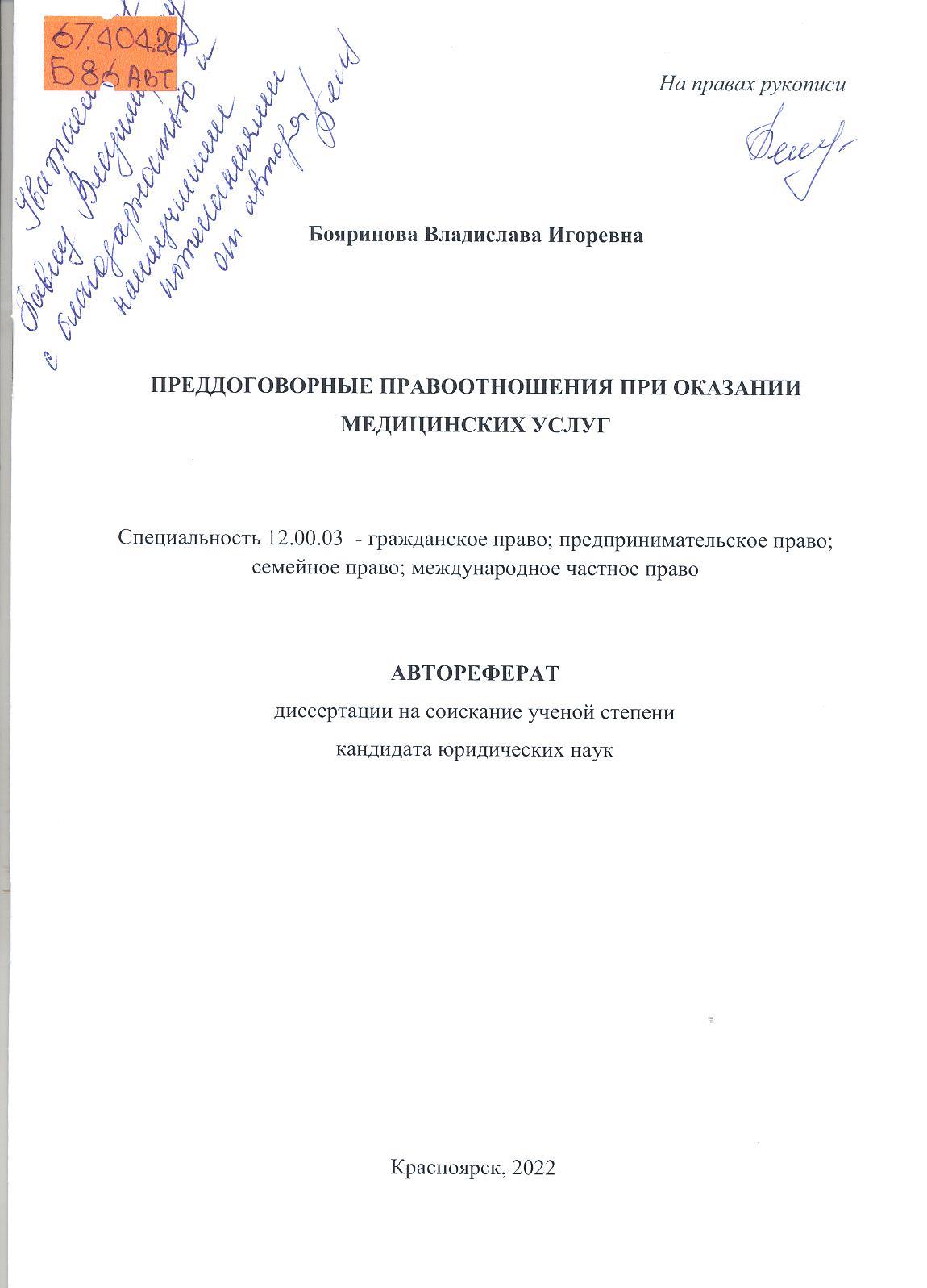 Преддоговорные правоотношения при оказании медицинских услуг: автореферат : 12.00.03