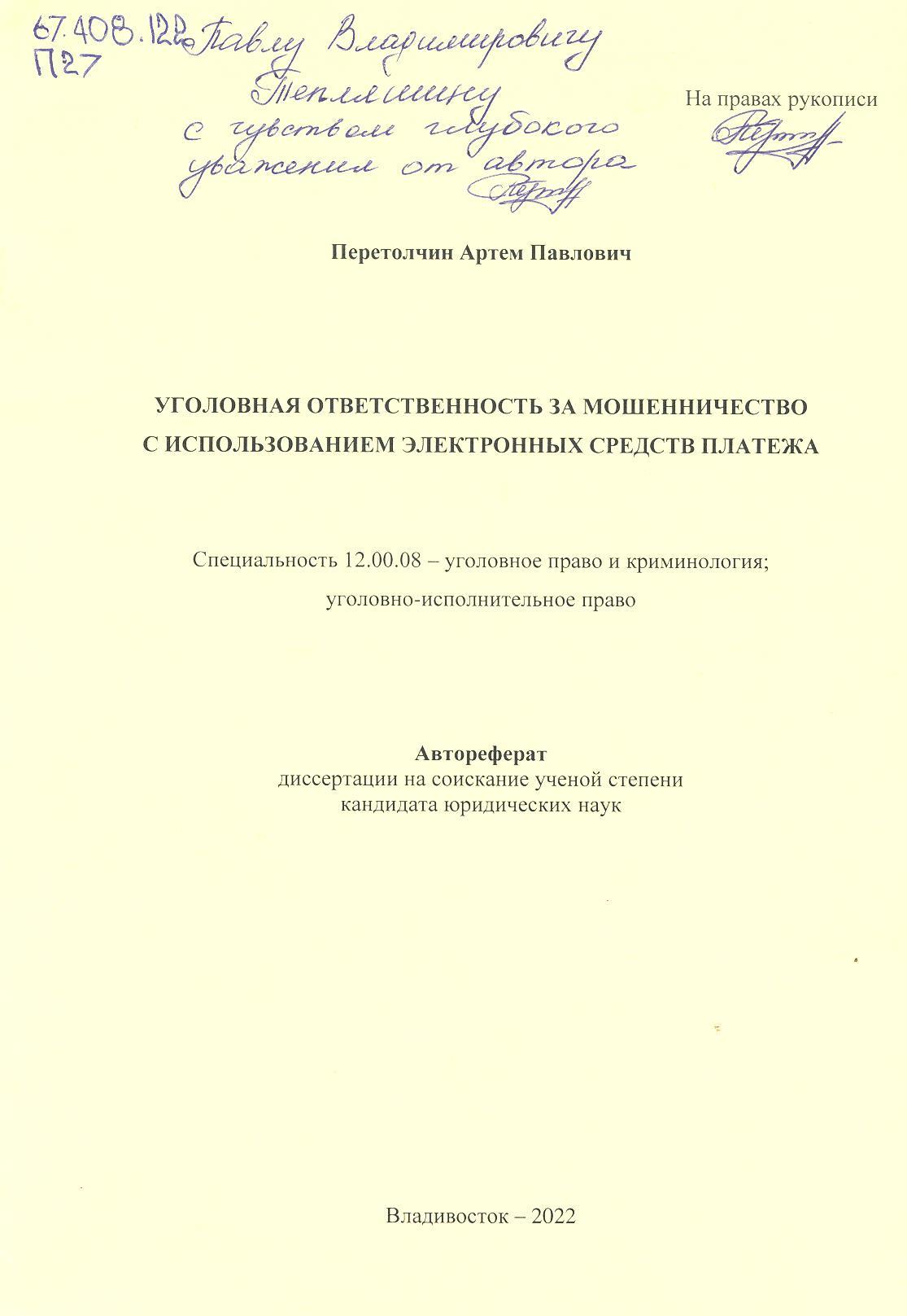 Уголовная ответственность за мошенничество с использованием электронных средств платежа: автореферат : 12.00.08