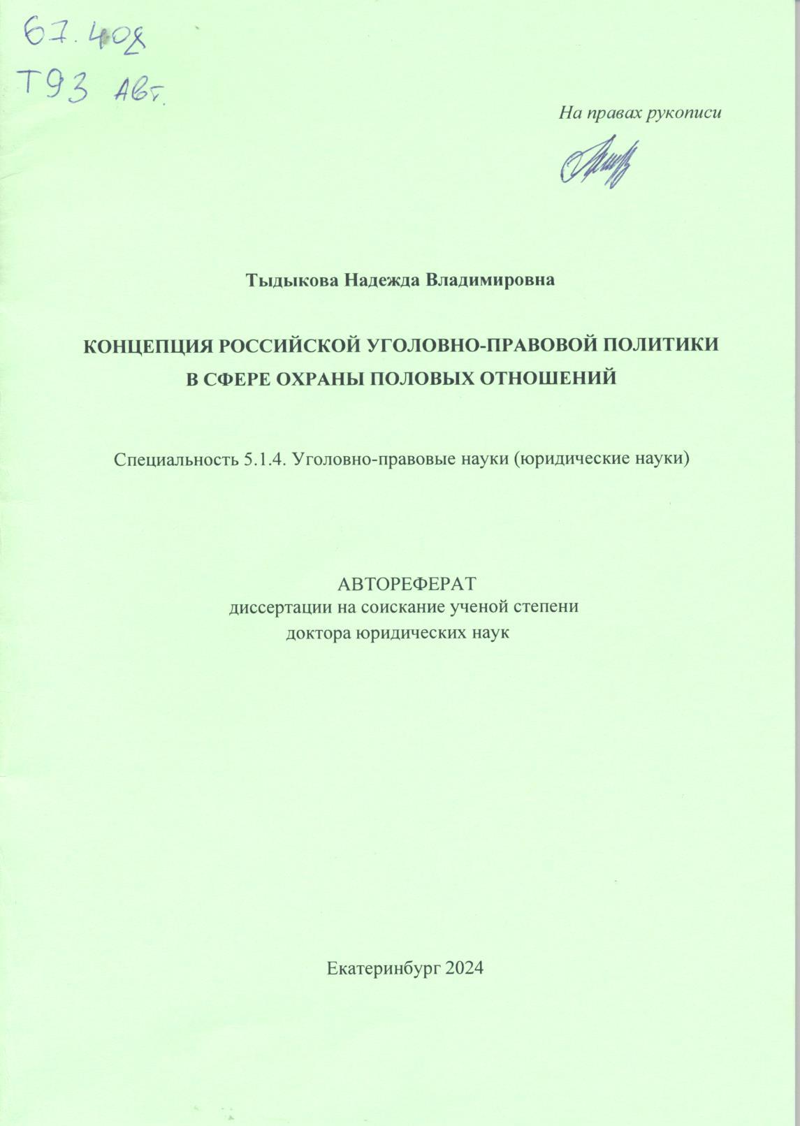 Концепция российской уголовно-правовой политики в сфере охраны половых отношений: специальность 5...: автореферат диссертации на соискание ученой степени доктора юридических наук