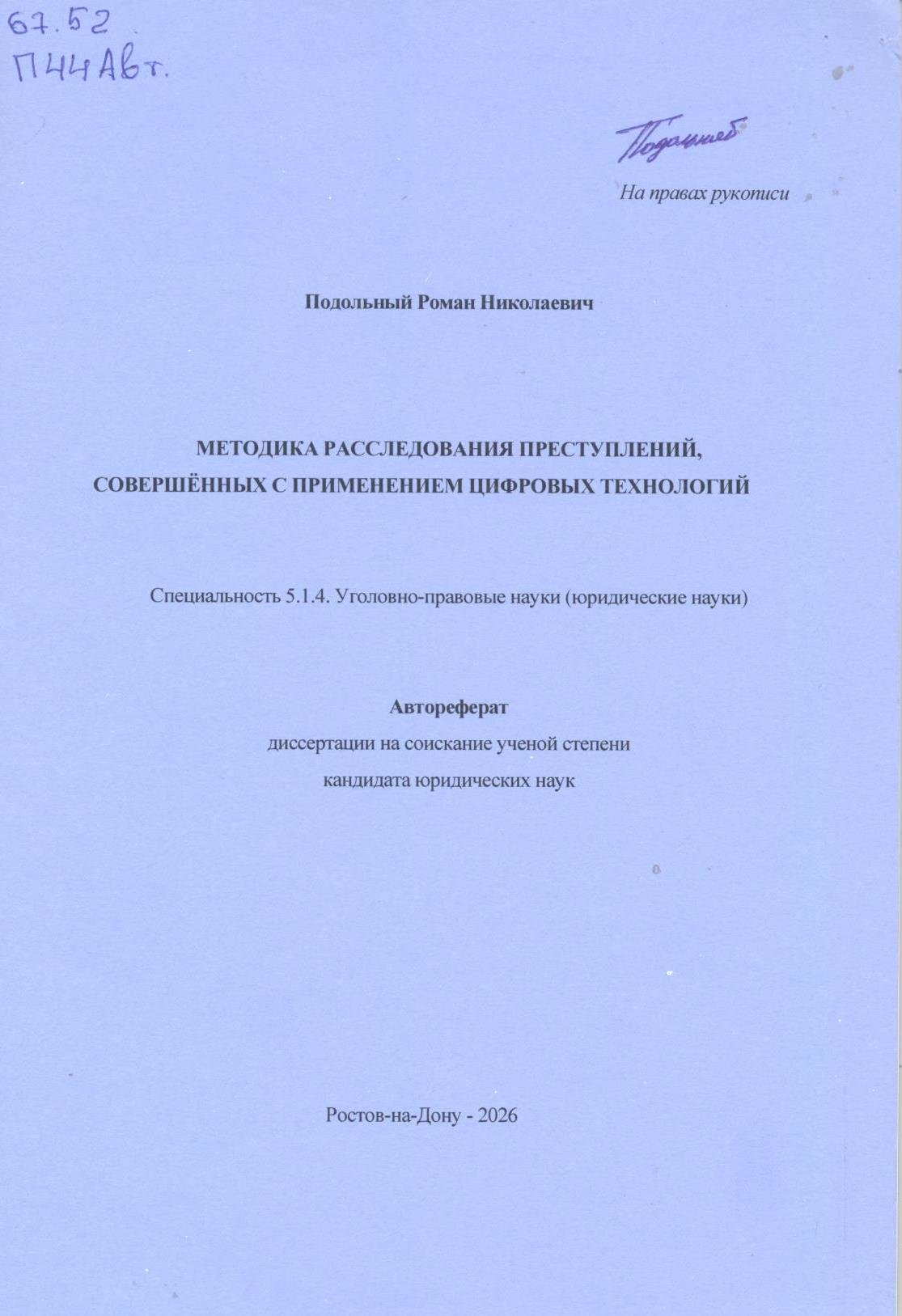 Методика расследования преступлений, совершенных с применением цифровых технологий: автореферат диссертации