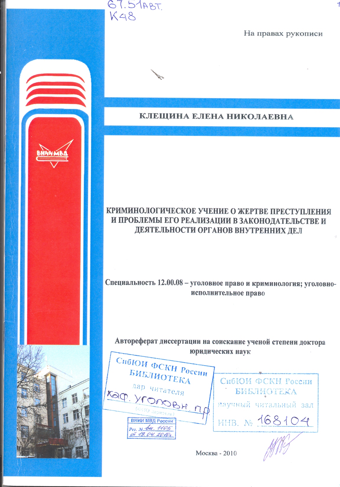 Криминологическое учение о жертве преступления и проблемы его реализации в законодательстве и дея...: автореферат : 12.00.08