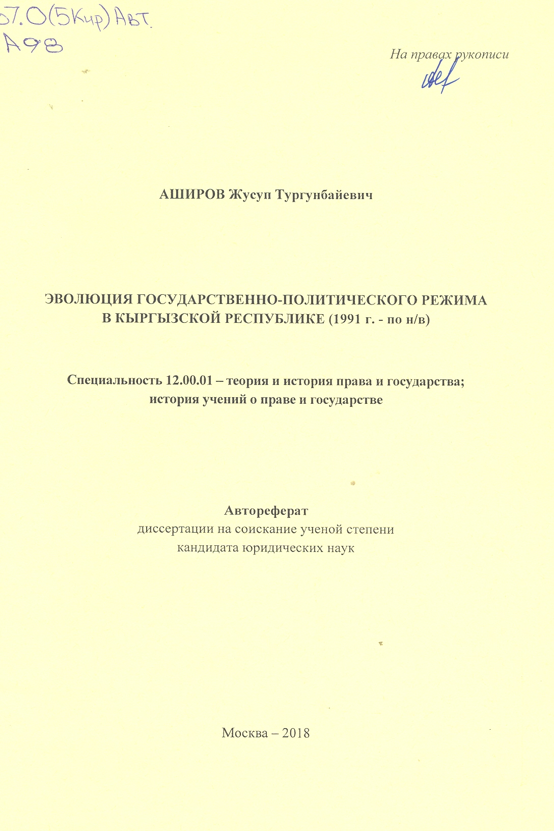 Эволюция государственно-политического режима в Кыргызской Республике (1991 г. - по н/в): автореферат : 12.00.01