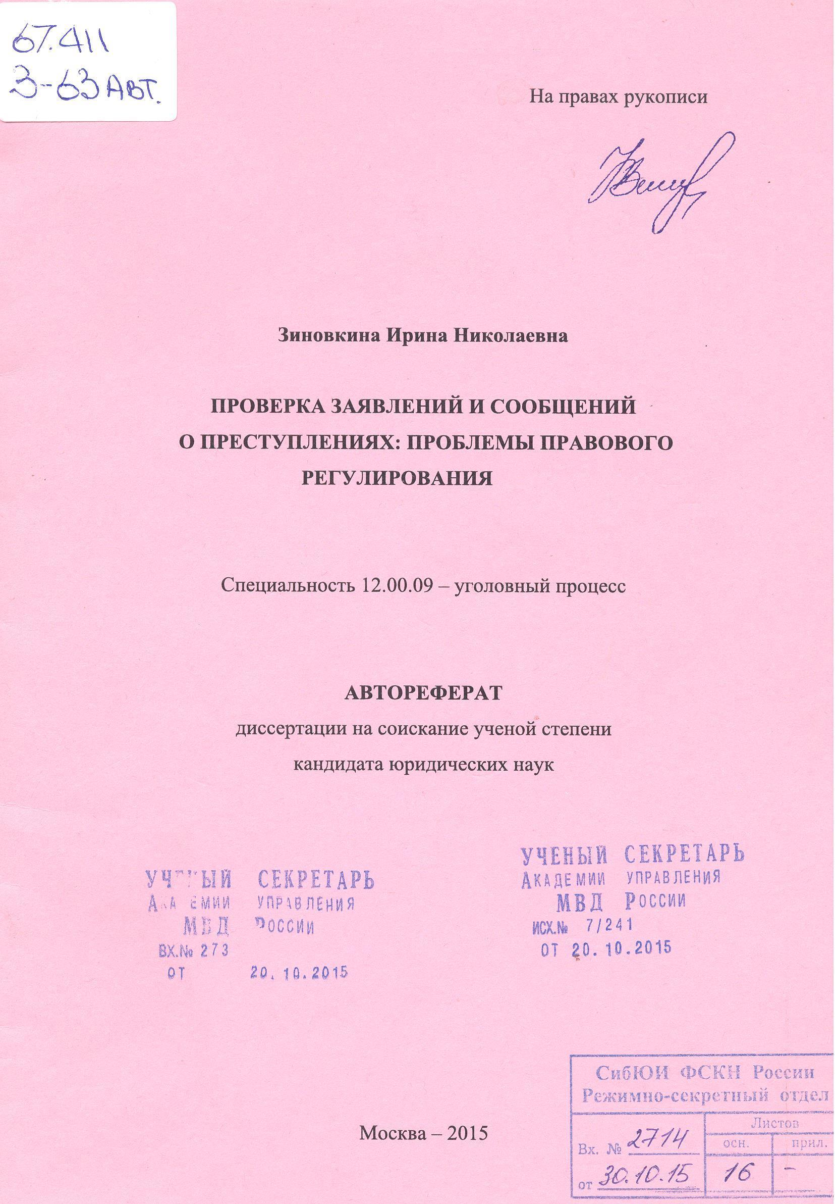 Проверка заявлений и сообщений о преступлениях: проблемы правового регулирования: автореферат : 12.00.09