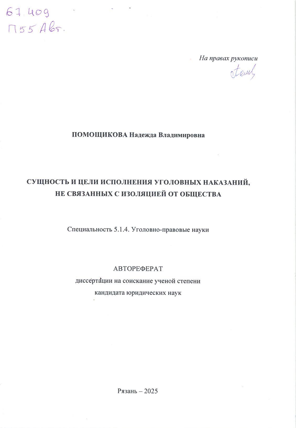 Сущность и цели исполнения уголовных наказаний, не связанных с изоляцией от общества: автореферат на соискание ученой степени кандидата юридических наук