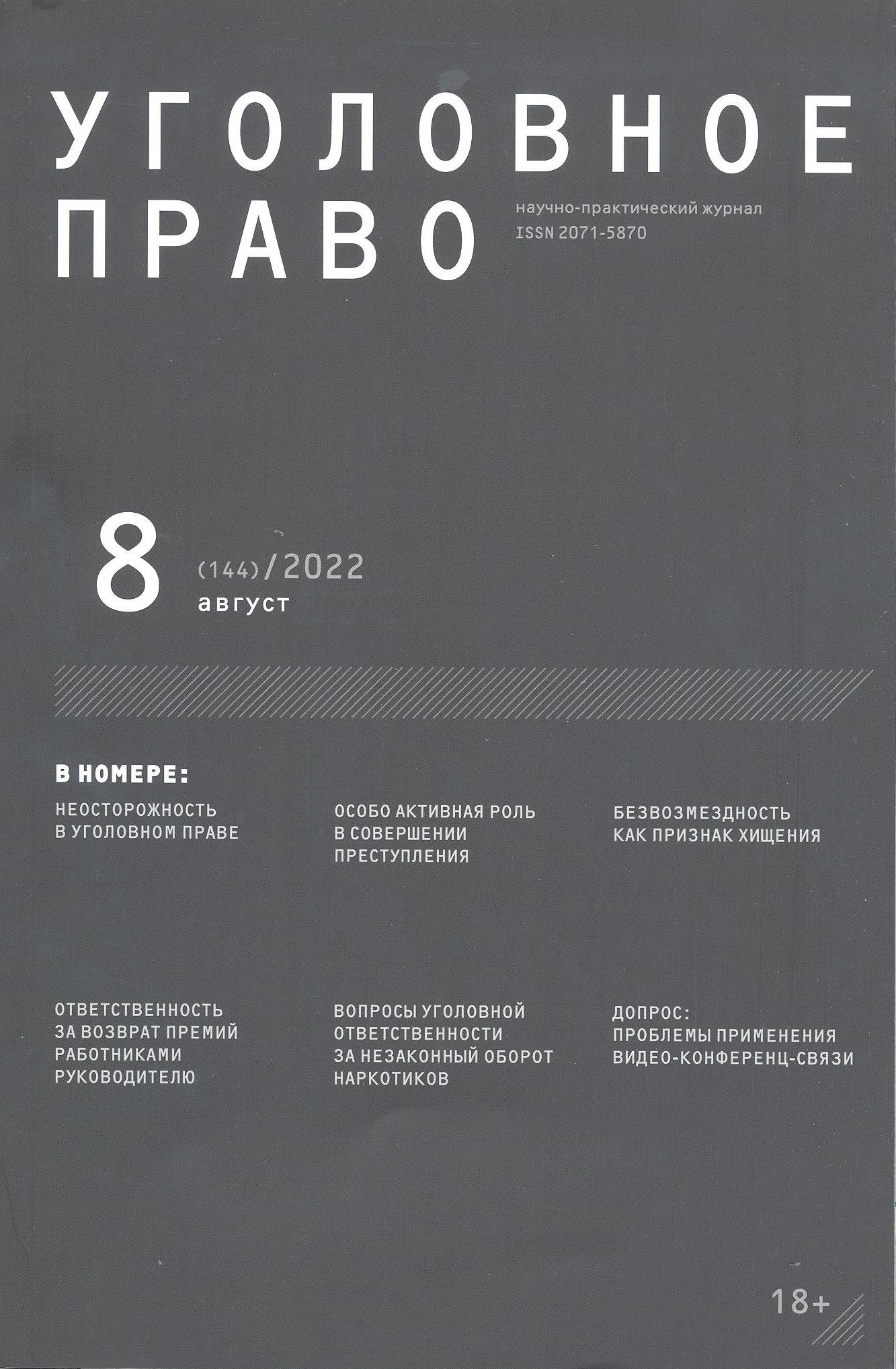 Безвозмездность как признак хищения, его формы и квалификация деяний / Виктор Николаевич Винокуров, Мамед Шахмамедович Муслимов. – 2022 // Уголовное право. – 2022. – N8. – С.8-19.