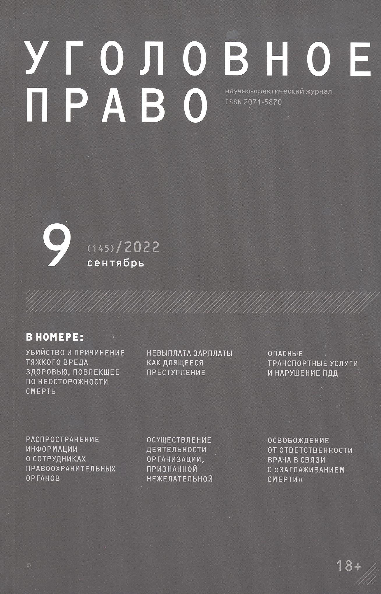 Квалификация распространения информации о сотрудниках правоохранительных органов с использованием информационно-телекоммуникационных технологий / Виктор Николаевич Винокуров, Анна Григорьевна Брагина. – 2022 // Уголовное право. – 2022. – N9. – С.3-9.