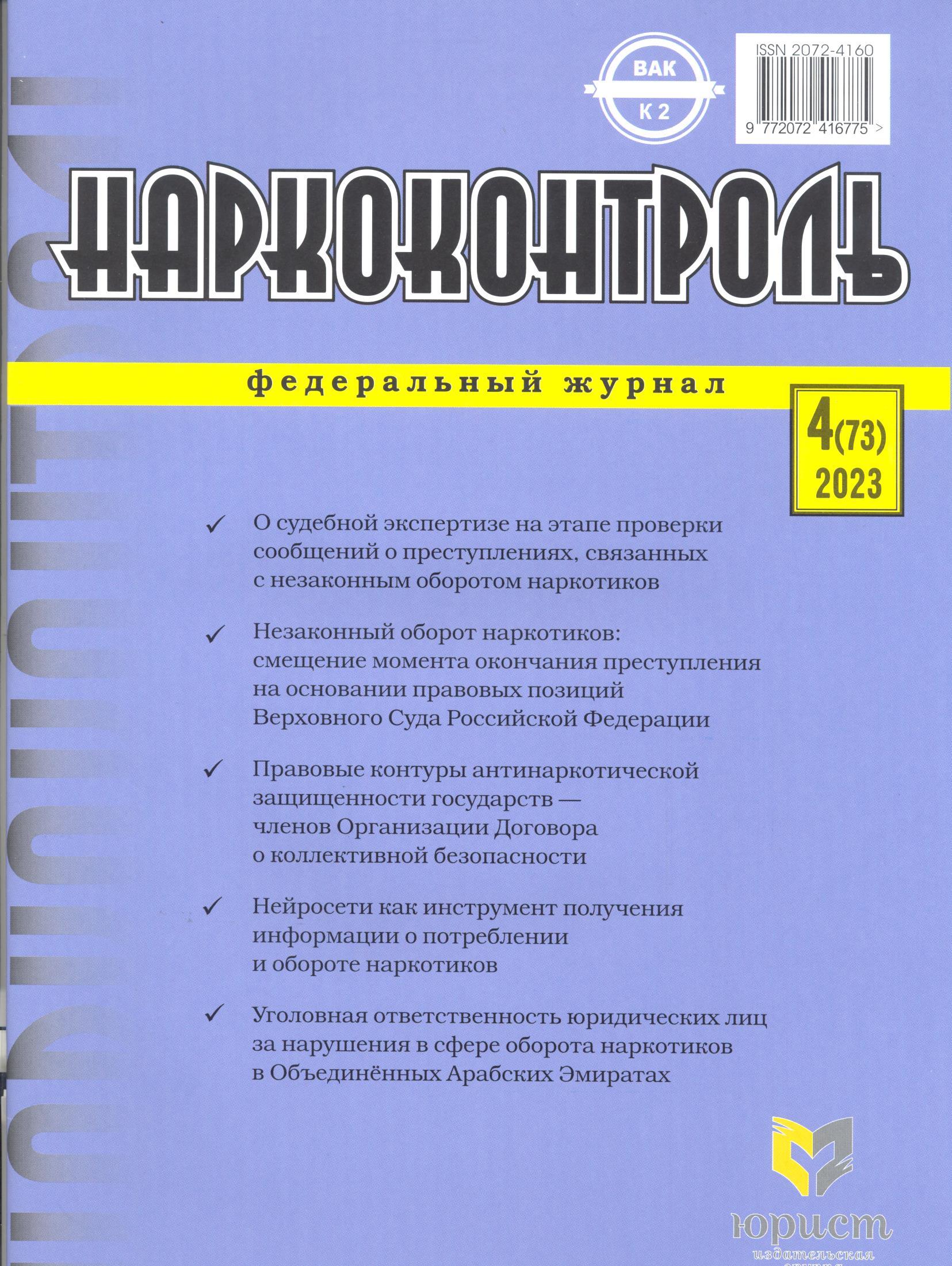 Незаконный оборот наркотиков: смещение момента окончания преступления на основании правовых позиций Верховного Суда Российской Федерации / Владимир Валерьевич Дубровин, Екатерина Геннадьевна Дубровина. – 2023. – DOI 10.18572/2072-4160-2023-4-6-8 // Наркоконтроль. – 2023. – N4. – С.6-8. – Режим доступа : http://lib.sibli.ru/elib/6-9 Дубровин.pdf.